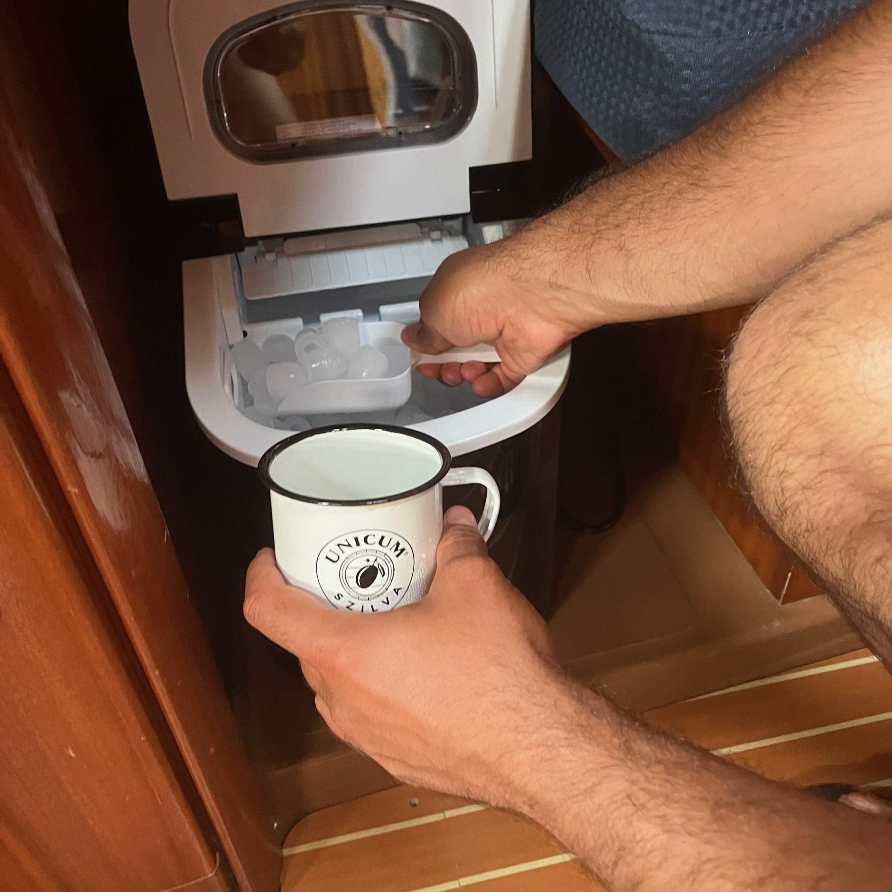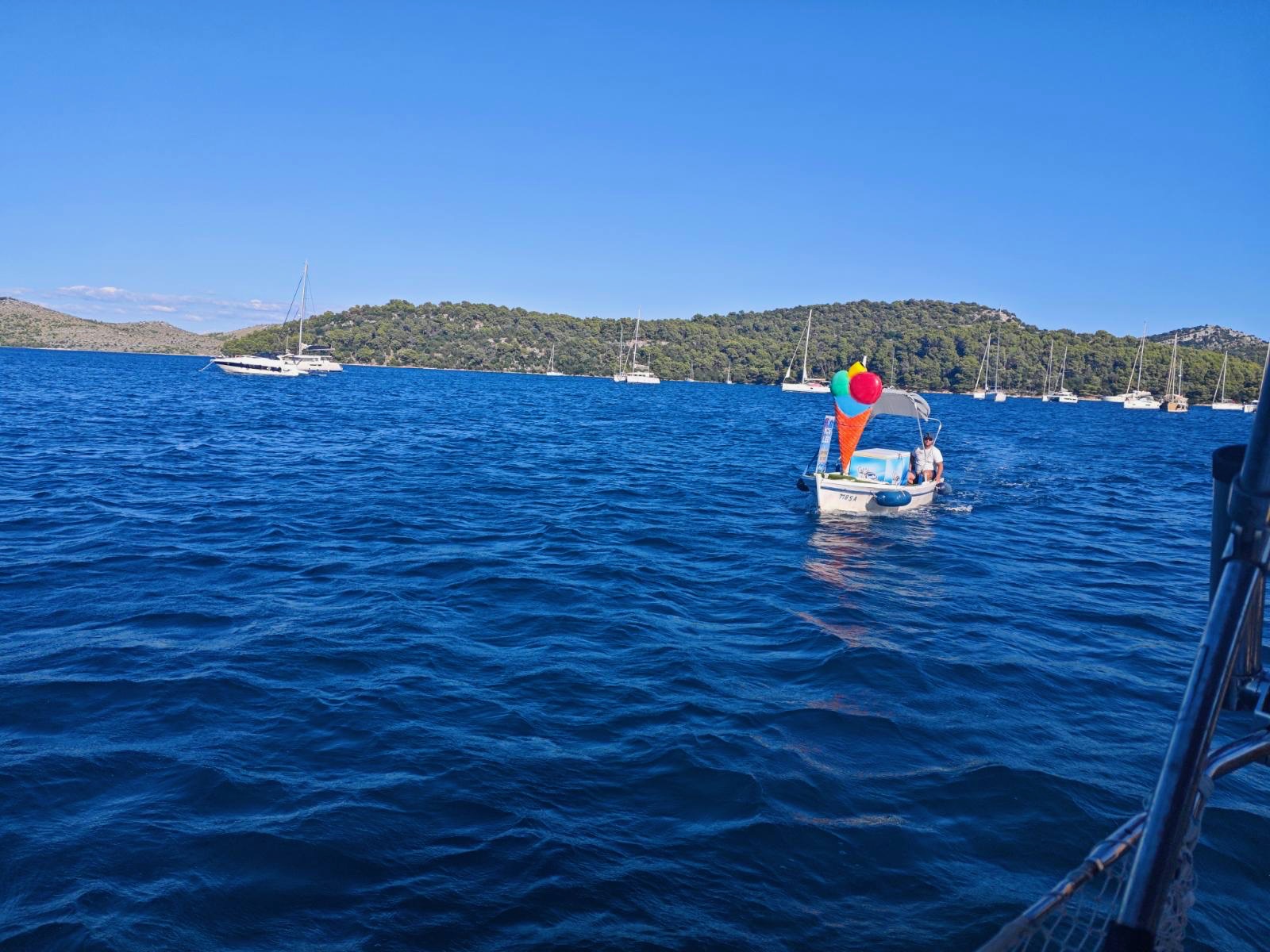 Nyáron ez a hely vicces: bolt és fagyis hajó járja a bójára kötött hajókat. A fagyis minket is megtalált. Vettünk is pár jégkrémet tőle, persze a parti ár kb. háromszorosáért, de azért milyen gyakran van lehetőségünk egy bóján, egy gyönyörű öbölben, a hajónkon ringatózva jégkrémet venni?!