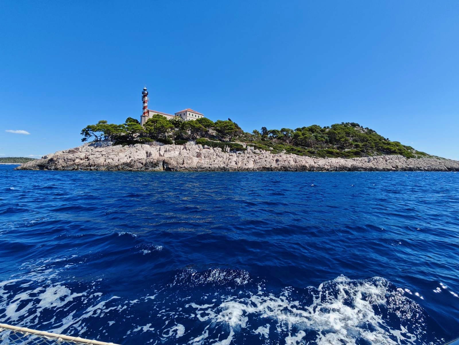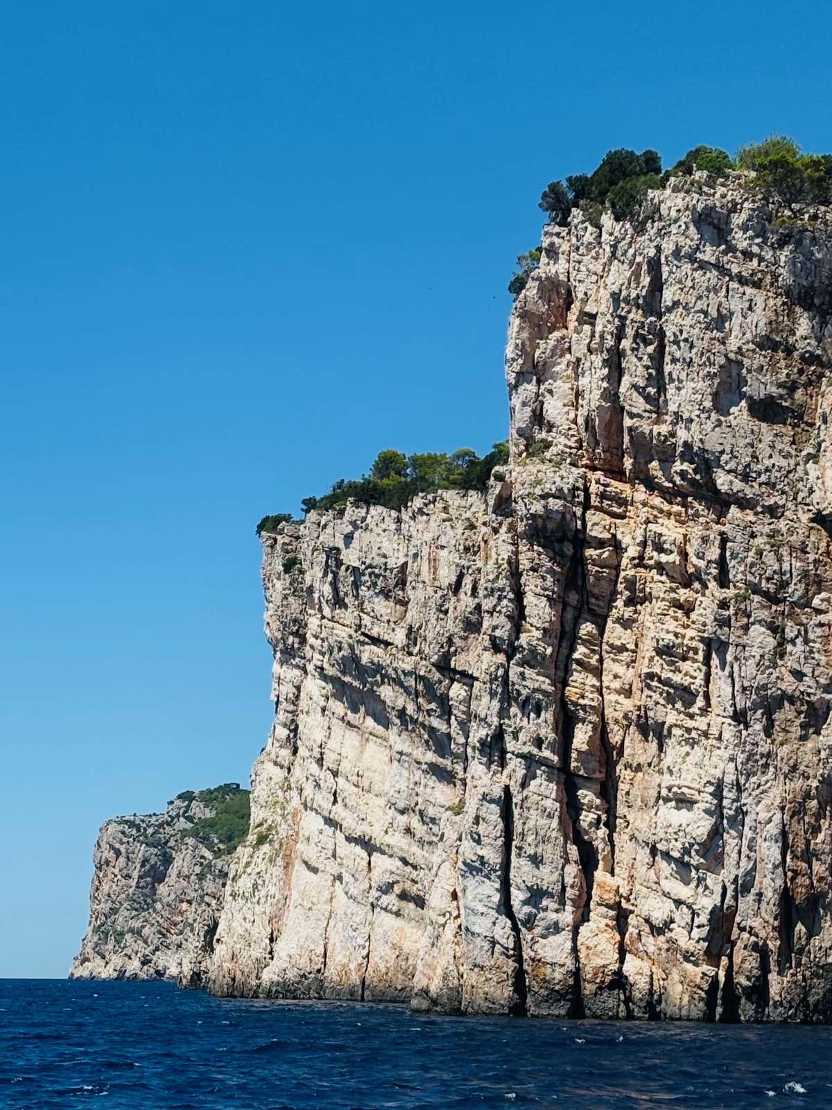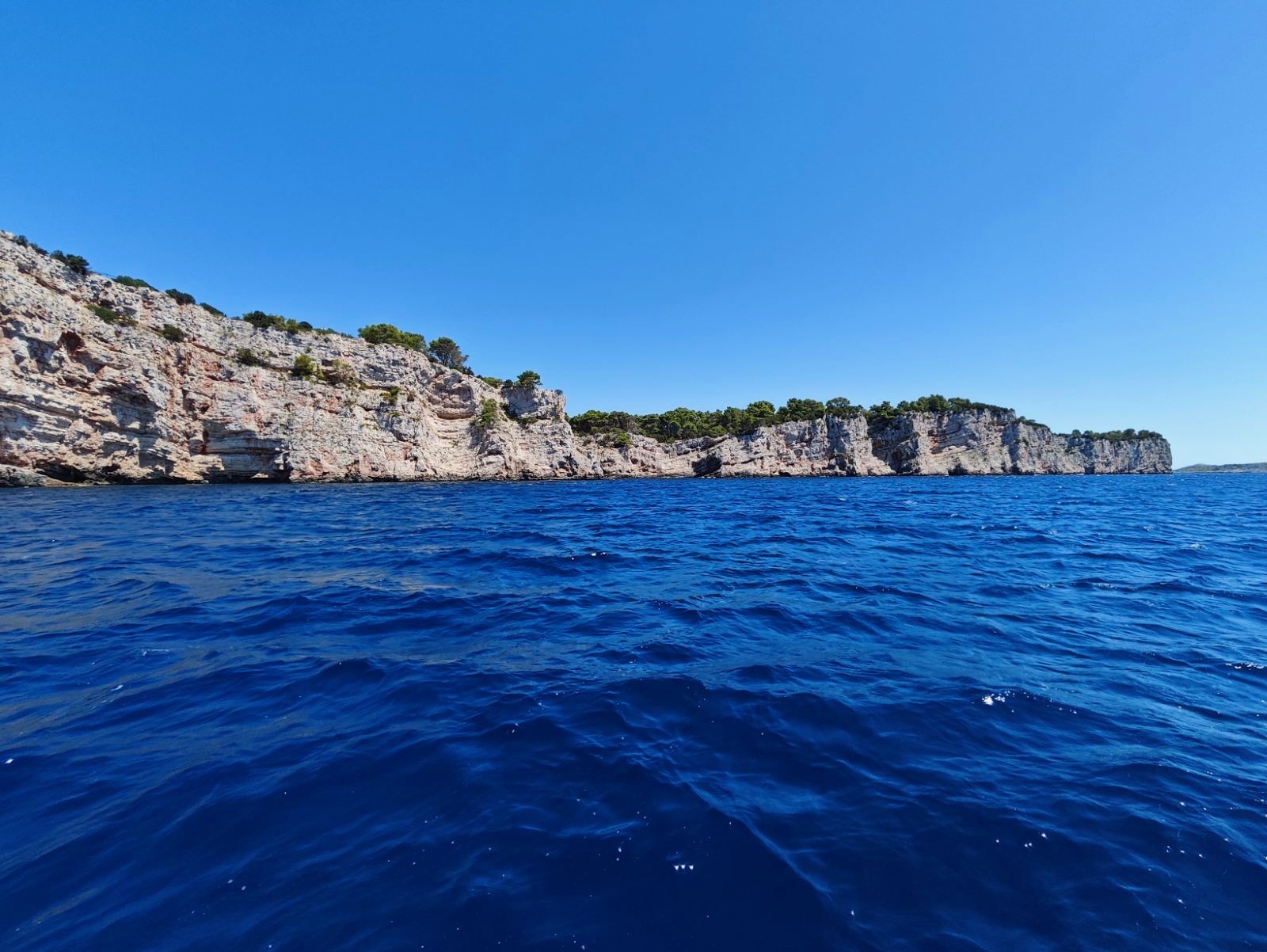 Majd kimentünk a nyílt tenger felé.. ez midig tetszik a csapatnak. Megnéztük Sestrice sziget gyönyörű világítótornyát, majd elmentünk a Dugi sziget külső oldalán megcsodálni a közel 100m magas függőleges sziklafalakat. Ha csendes a tenger, egészen közel mehetünk. Ezúttal is.