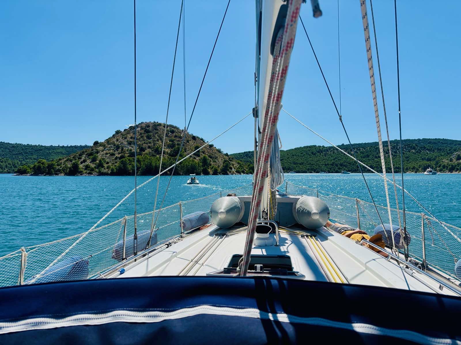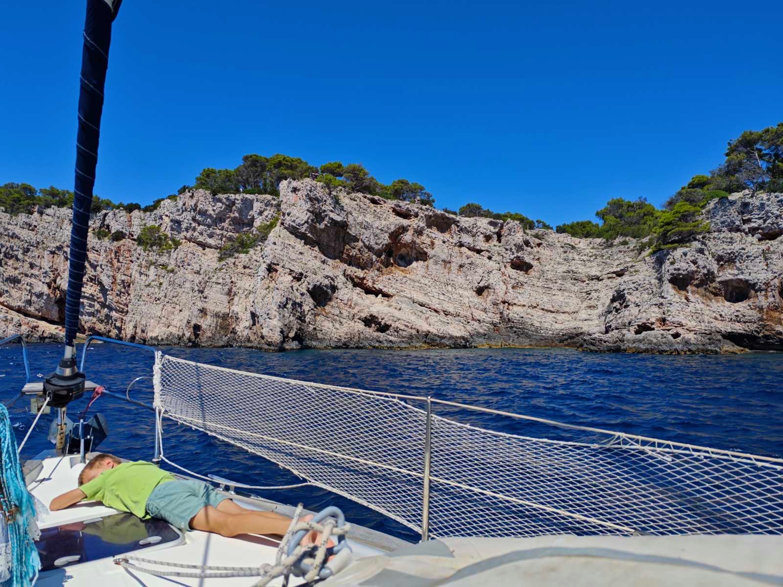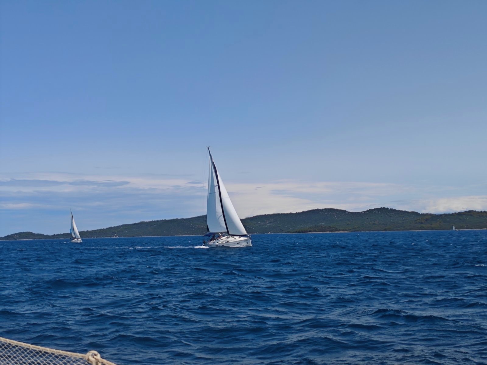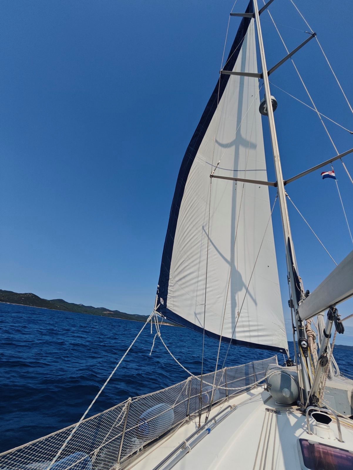 Innen a Veli-Rat felé ritkán tudunk vitorlázni. Észak-Nyugat felé megyünk, szigetek között. A jellemző szél itt mindig teljesen szemből fúj. Ezúttal egy anticiklonos Bora volt éppen. Szerencsére nem túl erős. Így Észak, Észak-Keleti szélben, éles negyedszélben szépen végig tudtuk vitorlázni az utat. Nagyon élvezte mindenki! Én is.